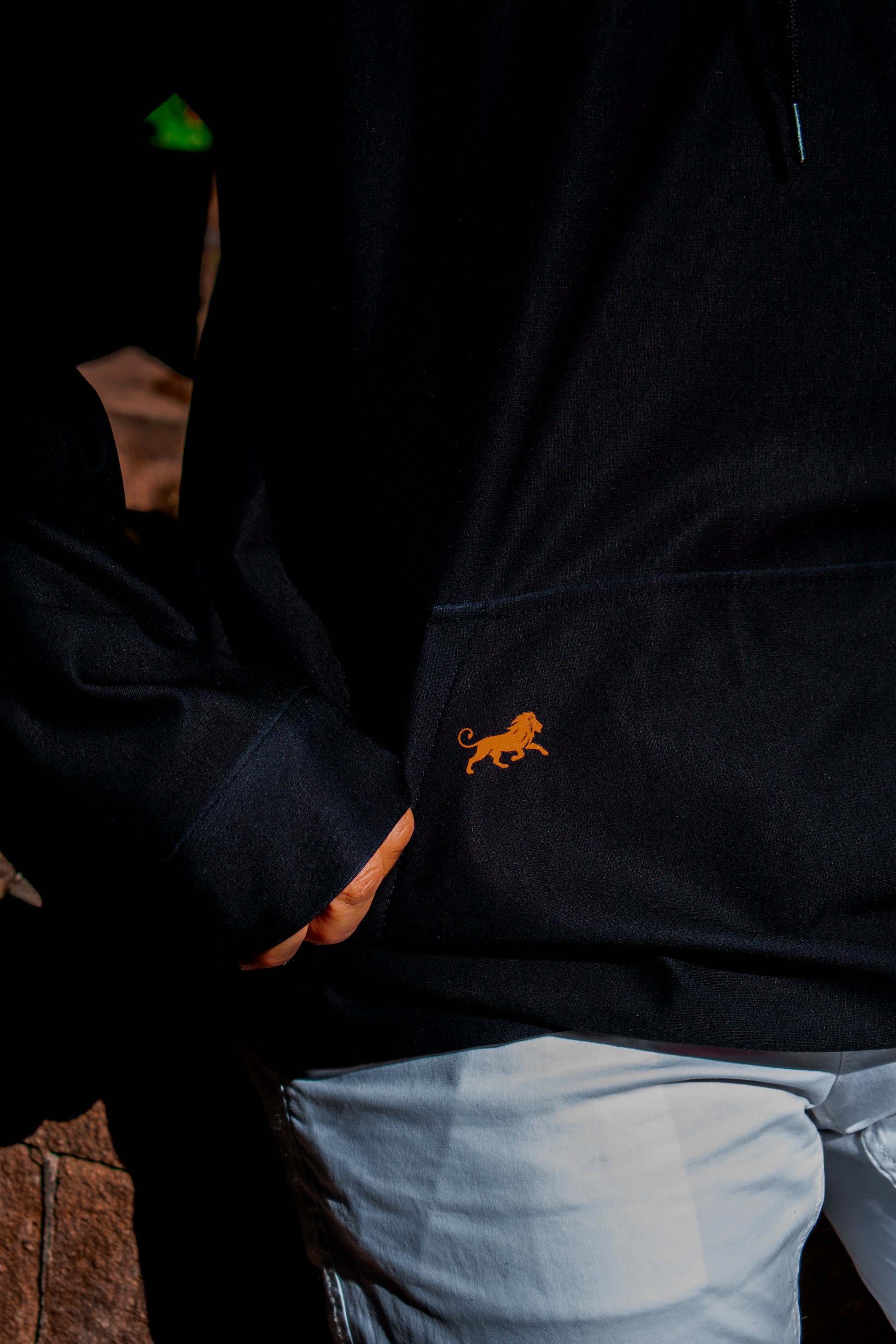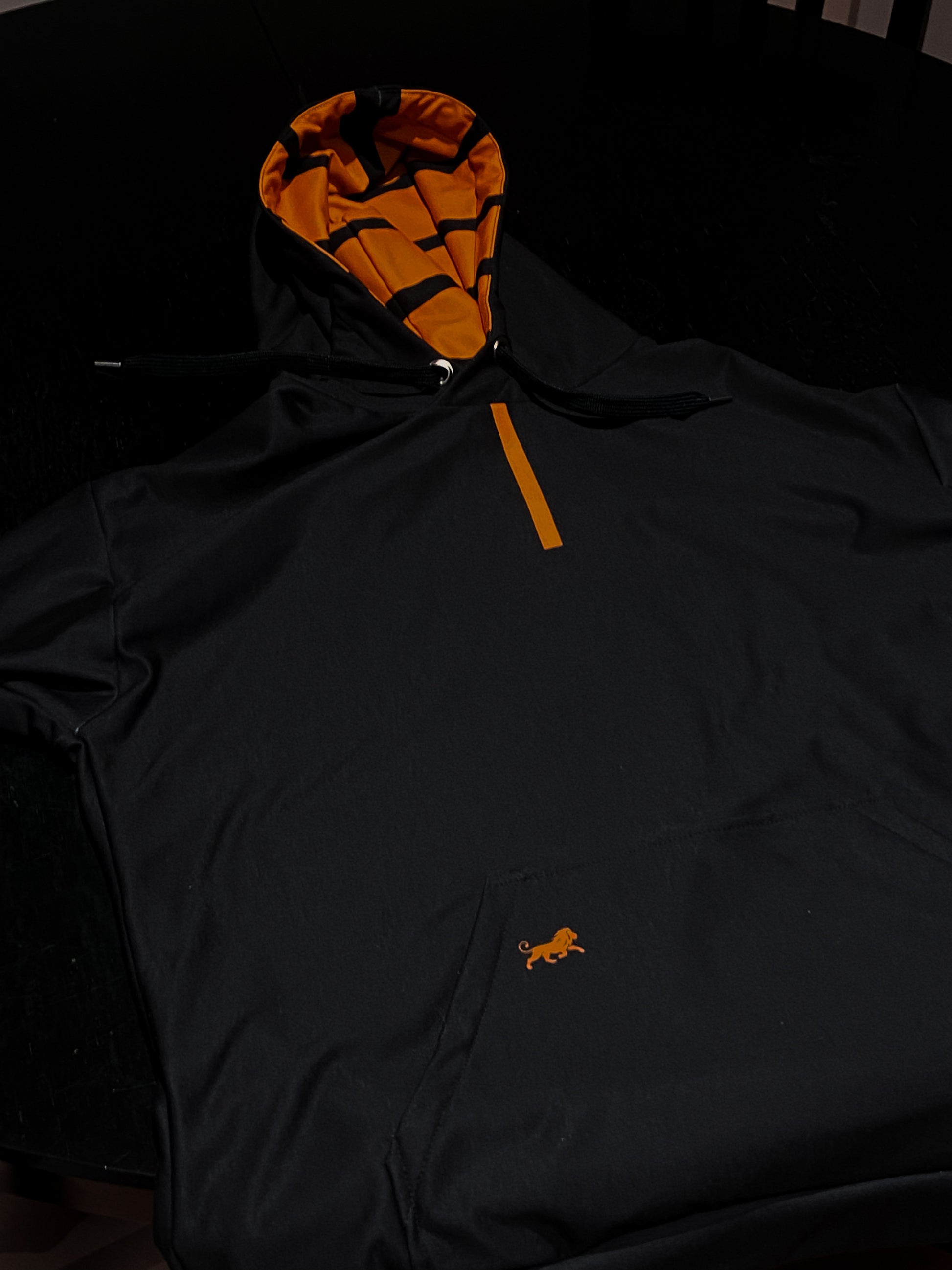 Esta sudadera negra de felpa premium se define por su contraste controlado y preciso: exterior en negro absoluto con una línea vertical naranja vibrante que desciende desde la capucha hasta el bajo pecho, mientras el interior de la capucha revela un naranja intenso con sutiles detalles geométricos en negro que evocan fuerza contenida. En el bolsillo, un pequeño león bordado en naranja actúa como firma discreta. Corte relajado, cordones negros y terminaciones impecables que equilibran audacia callada con refinamiento absoluto.